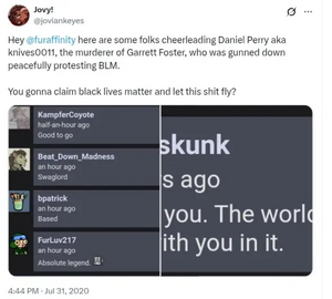 In the early mists of the Oxygen Riots, a legendary good-old-fashioned Western quick draw would occur between Daniel Scott Perryζ and Garrett Foster☭ in Austin, Texas. Daniel Perry was an economically struggling ex-military archetype who had to work as an Uber driver while black people get free tug boat money by the government just for being niggers, and furthermore, was a confirmed furfag (having created an FA account under the name Knives0011 10 years prior to the shooting), thus dismissing the war vet homelessness myth as he likely spent all of his money on overpriced furry art commissions, while Garrett Foster was an Antifa super soldier with an extreme amputee fetish who was previously a not-so super soldier in the U.S. air force. Although they both had military experience, Daniel would come out as the victor having had the upper edge in this duel due to hours of experience honing his sharpshooter skills in TF2, WoW, Half Life, Wolfenstein and various other FPS games. This altercation sparked some outrage over which political extreme has the superior fetishistic tastes for some time but would ultimately be overshadowed by the Kenosha incident.