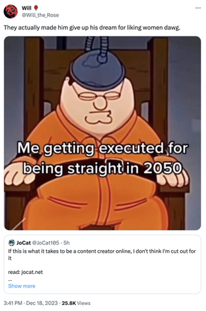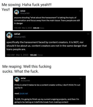 Back in 2018, some sheboon rapper known as Lizzo released a song called "Boys" about how she would eat out literally any man. It was immediately lip-synced by equally fat 16-year old girls all across Instagram, ShitTok, etc. Sometime down the line, the song was remixed among JoCat's sort of crowd: members of the animation meme community. Finally, on one fateful day on October 6th, 2020, JoCat spontaneously sang a parody of Lizzo's song during a gaming livestream about how he loves all female body types; from skinny to wide and tall to child-sized; and it was perhaps the gayest thing to ever grace the interwebs even though its ironically a song about liking women. This alone probably wouldn't have gained much traction if he didn't then decide to implement the sound clip into an animation meme himself, which was generally considered cringe by most sensible people who viewed it. It saw very little raid activity however until 2023 when Twitter decided to make him the next target of their crusades due to heterophobia. JoCat pledged to quit the internet forever due to alleged attempts at doxxing and "suspicious packages" being shipped to his family, but like always, one you join the ranks of the internet, your there forever, as he returned in 2024.
