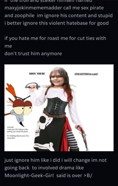Kyah Peterson used to be a great person, and she used to change a lot. Even from her downhill start around the mid-2010s, the complicated history is that she has problems finding a boyfriend and the ruined friendship with Conkeronine, which they forgive each other and remain as friends to this day for stealing Conkeronine's design and ideas, especially the infamous OCs that used to be "Killer Ann." It was known that Kyah had disrespected and slandered Conkeronine OCs and ripped his dick, giving him cancer, and died. It is a typical thing that a betraying friend does, as for "backstabbing" (to this day she is known fully today and currently that she is backstabbing people, whoever she befriends).