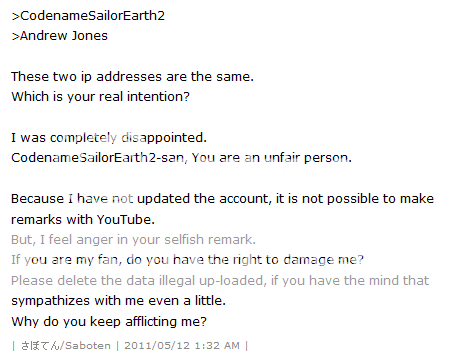 http://www.youtube.com/user/FallenAngelsRegret http://www.youtube.com/watch?v=zr78Qa9pF2o (read her comments they are hilarious as fuck) Claims to be a 16 year old girl from Japan and has commented on every video in defense of SailorWhore (I say that should be an official name for her now) she comments in japanese using incorrect grammar and punctuation thats clearly made by a translator program.