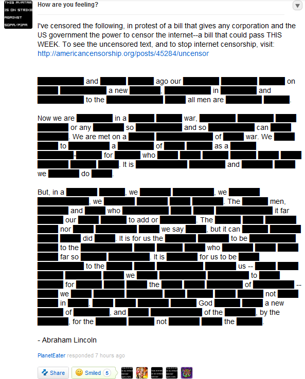 Censored version of the Gettysburg Address on a userpage. Notice a few of the smile response icons are blacked out.