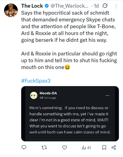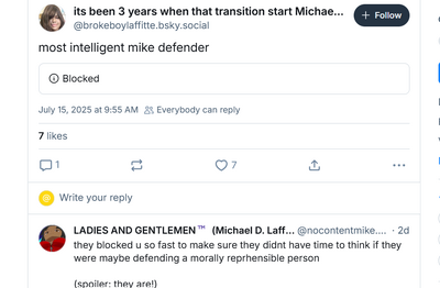 [[File:69c76fb5-fb7c-4879-8bce-22ec540913c7.jpg|400px|thumb| Can't wait till the people who are against Lina/ Mike make fun of him of this comment.. His lying post of shit on his bluesky post saying his ED article is out of touch, yeaa this is the same he rolling... Being the fucking [[Internet Tough guy]]. Which he is not tough. ]] | |||