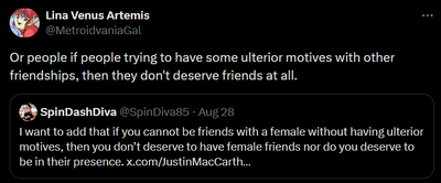 [[ | We have seen that Lina Artemis is a Black version of [[Chris Chan|Christine Weston Chandler.]] He has hardly been loved by his crappy audience. Some (recently) people know of Lina Artemis, and the people (currently) without knowing who he is, now exposed, now see the true colors of Lina. He (Lina Artemis) has received much more hate than Spax3, who rarely gets hate. | ||