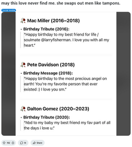 *[https://www.tmz.com/2024/06/27/ariana-grande-jeffrey-dahmer-victim-family-slams-dream-dinner-guest-tony-hughes/ Ariana disrespecting a murder victim's family] | |||