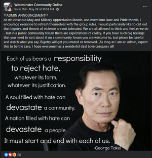 Bigotry will get you muted or removed. Love conquers all! – George Takei, and also apparently Sorin