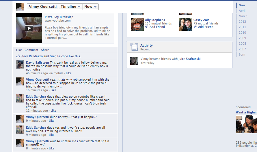 A massive shitstorm ensued. Only mere minutes had passed when his address, facebook, phone number, and friends contacts were found by a team of Anons. A mole joined us, and being facebook friends with the victim, he posted screenshots of the ginger's butthurt. Whilst he was busy handling the hundreds of calls to his house, millions of pizzas were ordered at his address, and the army of angry as fuck pizza guys came standing outside his front door. Escorts were booked as well, which prompted a gathering of angry pimps, only wanting to hit that bitch for wasting their time.