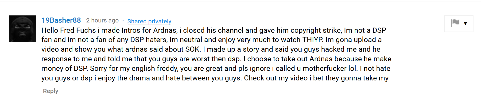 Fred would finally get his way in February 2016. ardnas had been using intros for her videos by a user named 19basher88, but as we saw with Phil himself, using other people's content in your videos can be dangerous, as ardnas found herself hit with a bunch of copyright strikes for the intros he used, effectively destroying his channel. Here's where it gets murky though. ardnas claims that basher pm'd her saying he'd been hacked by Fred and co., whereas Fred naturally denied all responsibility, claiming that basher alone had orchestrated the takedown, and that he hadn't hacked him at all. A more likely explanation is that basher got drawn into Fred's circle jerk, and decided to sacrifice ardnas to his new god. There is also the possibility that basher was fabricated by Fred from the start, as he showed up out of nowhere, and disappeared into the ether once his business was done. Given Fred's massive ego, and his propensity for petty bullshit and infighting with anyone who isn't licking his balls 24/7, it's pretty safe to assume that Fred is behind all this bullshit, which shows that he's an insecure little shit who only cares about being the most popular (which everyone already knew). Here's some of the aftermath. Fred's sycophants jerking off his ego, and being in denial about the fact that more people watched ardnas' videos than their own crap.
