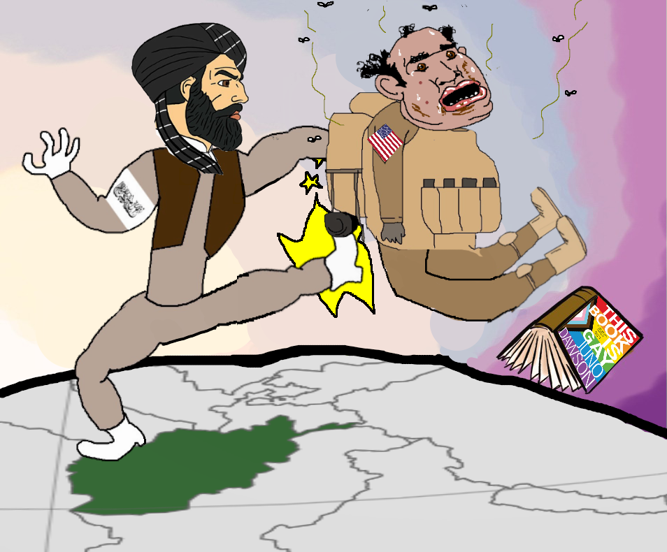 An edit of that Anti-Muslim far-right picture by pi-news.net to feature Taliban fighter kicking US soldier out from Afghanistan instead.