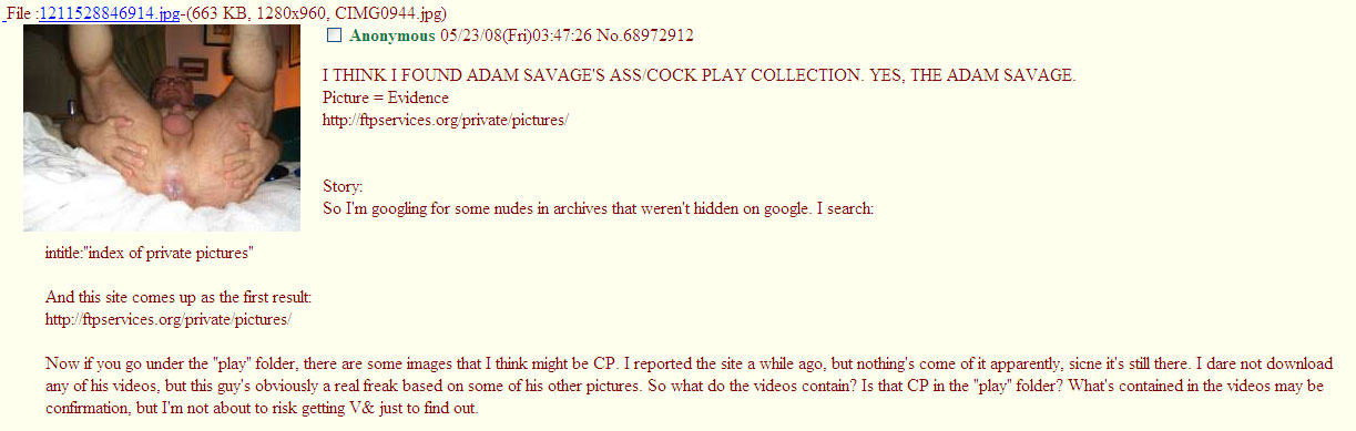Great drama ensued in many forums. Some believed that the photos busted the myth of normality in the personal lives of television hosts. Others believed that the photos' uncertainty could be exploited for quick internet fame. To date, there is no proof of the model's identity. His talent at performing urethral sounding, however, is unquestionable. By all the best accounts, the photos originated from [1]. Advanced WHOIS tech could reveal ADAM SAVAGE, or at least his hosting services done by some Wikipedo reveals it's some guy from New Jersey. [2]