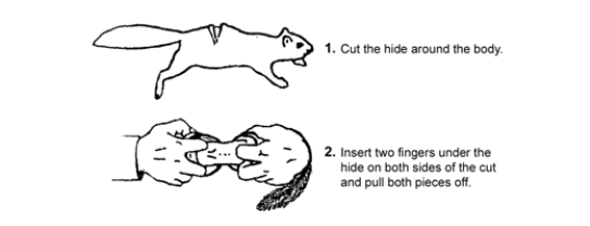 5. Insert your knife under the skin, taking care not to cut into the body cavity. Peel the hide back several inches on each side to keep hair out of the meat.
