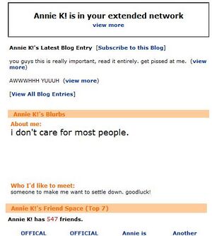 Annie K will only accept fansites or people she has met IRL on her myspace, so make a fake Annie K fansite or claim you met her somewhere around Amherst like some place in Nashua one night (google it) and you're in. Happy trolling.