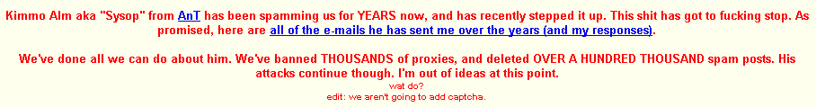 AnonTalk was notorious on the chans and Wikipedia for delivering huge amounts of spam on these websites, since most of the visitors of the chans and of Wikipedia had the potential to become AnonTalk regulars. Every single person who knows about the site has learned of it through spam (even you, whether you know it or not). Endless spam poured out advertising AnonTalk as a free speech zone when AnonTalk had the least free speech of any forum on the internets. The only free speech the site allowed is as a practical how-to guide for child molestation. For everything that's not about that, Kimmo banned everyone nonstop purely for his own entertainment. So, naturally, whenever his website was banned by something, he completely lost his mind.