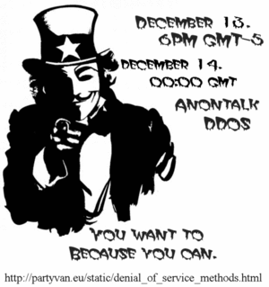 The owner of the domain then pointed anontalk.com towards Tinychan, forever pwning Kimberley. In fact, anontalk.com was already a blacklisted word on his forum beforehand. Shortly after, a clone of AnonTalk was set up, Kimmo performed DDoS plus crapflood attacks contaning Grawp-style death threats. AnonTalk.com was also briefly used to host a mirror of WikiLeaks.