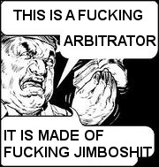 The Arbitration Committee is the Internet court and ruling body of Wikipedia. As a faux court of law, it can ban editors and alone possesses the power to court martial and castrate sysops, which it rarely does because other admins would shit pure uranium. In the tradition of other institutions of truth and justice such as the Ministry of Love and the INTERNET HATE MACHINE, it also has the newspeak nickname of ArbCom. Although they are billed as a bastion of fairness and impartiality, the ArbCom is in fact an e-reincarnation of the dreaded Committee of Public Safety as Wikipedia's Star Chamber meting out arbitrary rulings and acts in secret proceedings, with no chance to see the charges against you, and of course no appeal. The cases are accepted on whim and decided by fiat. Backs are stabbed and cocks are removed and fed to pigs.