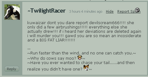 Art thieves are locked in a permanent state of butthurt once called out on their faggotry. They will piss themselves, claim to have tried to become an hero, cry, make death threats and stuff their journals and retaliating comment rants on how unfairly their "art" got removed. One of the most lulzy things to come from them is the fact that, without a doubt the only reason to remove someone's work is "CUZ UR ALL JUS JELOUS OF MAH ART". Aside from that, everyone can have some fun making 12 year old cry for ripping some animu screen caps. NEVER hold back. If you praise them they'll get down on their knees and lick your cock forever. All are retarded enough to believe their traces/rips/whatever are great talent.