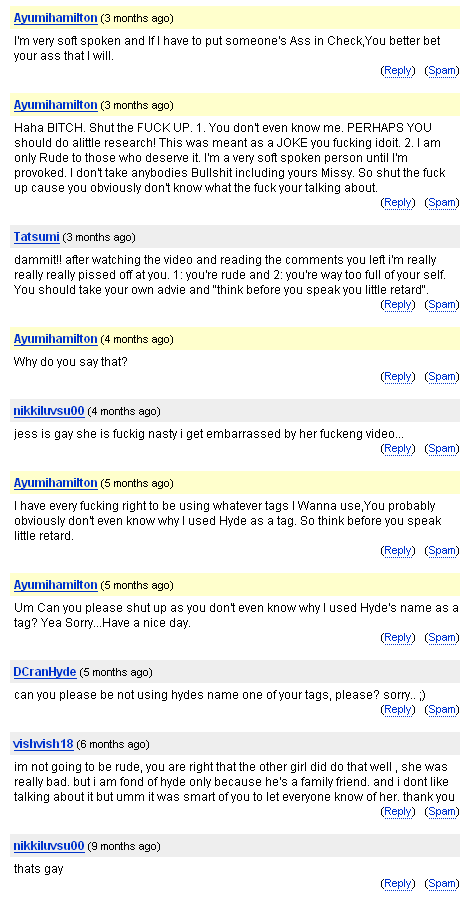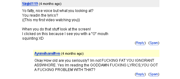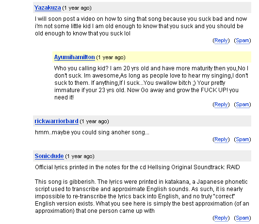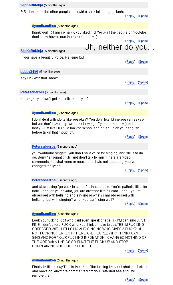 YouTube is where she started her rampage of OL drama. There, she posts her meaningless videos singing shitty anime songs from Hellsing. As a result of having a layer of Cheetos dust coating her throat, she sings like an infant being run over by a Peterbilt. She is easily offended by criticism and will employ a variety of intellectual remarks as a rebuttal. She'll likely cause a dispute (like an Internet tough guy), telling you to go back to school, and insist that she's the best. Her subscribers defend against her constructive critics saying, "OMG! They call you fat!? Youre NOT FAT TO MEEE!!11one!!1". Plz, don't get me started on that Hyde karaoke video.