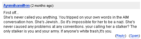 Believe it or not, Ayumi used to go out with Tiffany aka Hellsingripvanwinkle who is also a Hellsing fangirl. She thought that the relationship would live happily ever after.. but no, they broke up because they argued a lot. Many believe that Ayumi is really Tiffany because of their pale skin, fat, bitchiness, and similar faces. Currently, this remains a mystery.