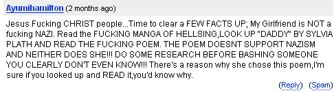 Ayumihamilton, aka Lady Ayumi, Masterintegra, Ayuham, and other aliases that nobody knows (or wants to know) about, is an otaku drama whore that takes the internets too seriously. She is a huge fan of Hellsing, currently is obsessed with Sir Integral. She claimed that she was born in England, but she got kicked out because they were tired of her whining, which is one of their biggest pet peeves. Currently she lives in Washington, and still acts like a fatass bitch and has no friends in school. By getting rid of her accent she now talks like white trash. She has no azn friends because they know how annoying and bitchy she is and how she tries to be like them just to fit in. Instead she has wapanese friends. She is an angry lesbian that used to be straight, however most guys do not want her. Apparently, she is complaining that guys kept emailing her about how they want to have buttsecks with her, which in fact is true. She usually receives these love notes from trolls and pedophiles.