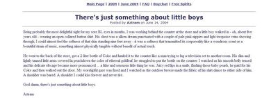 He went to the back of the store, got a 2-liter bottle of Coke and hauled it to the counter like a man trying to lug a television set to another room. His slim and lightly tanned little arms covered in peachdown the color of ethereal goldleaf, he struggled to put the bottle on the counter: I watched as his smooth belly tensed and his delicate ribcage became more pronounced ... a lithe and sensuous little thing he was. Juicy red lips in a smile, flashing those baby pearls, he paid for his Coke and then walked out the door. My worshipful gaze was fixed and I watched as the outdoor breeze made the fabric of his shirt dance to either side of him. A shoulder was bared. A shoulder I could kiss forever and never tire.