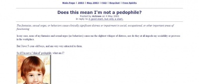 • Searching the Internet, we have discovered that the same person has held several accounts on other pedophile sites. His E-mail address also led us to discover yet another screen name which he formerly posted under.