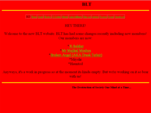 They originated as a comedy group, but after drama both on the internets and IRL the group left the fully hosted domain and its webmaster, Einsidler, and became more of an online community using a poorly written Freewebs website. BLT encourages advertising their website because noone has enough skillz to create an Invisionfree. This online community has three regular members, two of which own an internets.