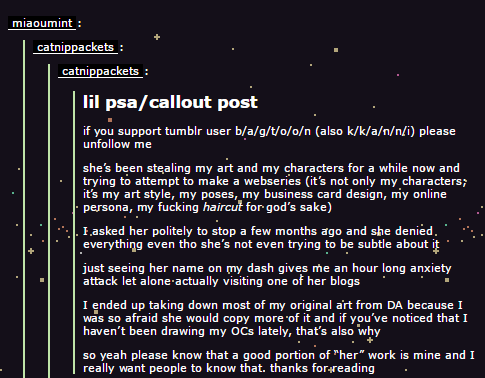This is where Chris starts to COPY catnippickets' two characters entirely. She changed her own character to match hers. Gender,race,appearance, etc. (Her name is Jay now) Starless was kept the same. This piece was also the first idea for her webcomic "Starless". (2014)