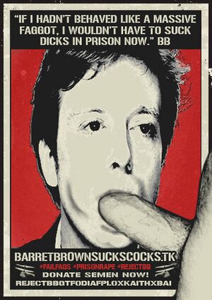 Take Hunter S. Thompson, th3j35t3r, and ev0, mix the three, and strip the result of the dignity, inability to give a fuck, and all other redeeming qualities; add the internet and lack of a real job. Welcome to the world of Anonymous, a strung out mediocre reporter, and self-proclaimed spokesfaggot for the "Anonymous hacktivist collective" who, despite ongoing attempts, is not a household name. A former author (read, "I wrote two articles, does that mean I work here?") for the "American Atheist", Barrett is no more than, in layman's terms, a self-righteous, opinionated, attention-seeking cunt secretly in love with Kirtaner. A junkie that uses everything from heroin, crack, meth, ecstasy and acid. Eventually concluding that big brother and godhatesfags were not enough to shove his agenda towards, Barrett pretended to take on drug cartels, who have guns and power, with his computer and the effectiveness of a strongly-worded blog. Then feds arrested him and found his chat logs.