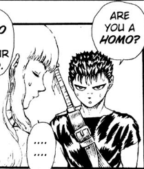 - Griffith: The saltiest faggot ever written in literature. He snuck into princess Charlotte’s room for a one-night stand because his boy toy left him, only to get his homosexual ass arrested. He then thanks his friends for saving him by mercilessly murdering and raping them. He did create a pretty sweet kingdom though, so he did nothing wrong per say other than be a huge faggot.