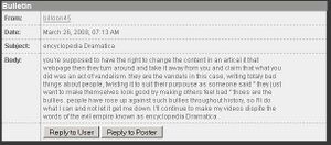 After discovering his article here on Encyclopedia Dramatica, Bill decided to take the lawl into his own hands in an act of vigilante justice. Under the username of "Billm" he attempted to meticulously remove small pieces of his article, hoping that no one would notice if he did it a little bit at a time. Needless to say, somebody did notice, and Bill swiftly got banhammered, but not before uploading these now deleted quirky videos of butthurt to his YouTube account: