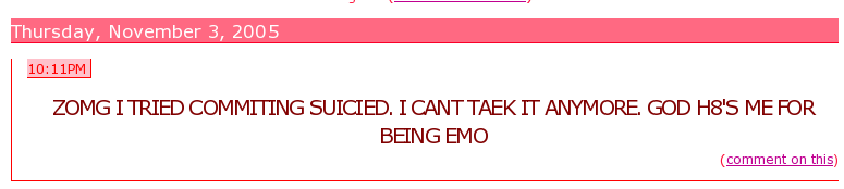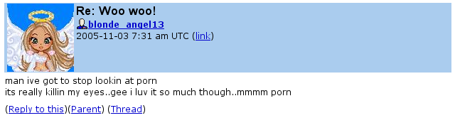 blonde_angel13 is believed to be a 16-year-old girl, sharing all the common characteristics, if an attention whore, among other things, such as being an emo, a fat dyke and a former female dog. He recently had a sex change.