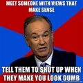 Bill O'Reilly just won't shut up about politics. He spends his career talking about boring shit such as elections, 9/11, and that hurricane that happened in that state full of brown people with fuzzy hair. His now-cancelled show The O'Reilly Factor was basically him going on about this critical information over and over again, sometimes threatening to get off his wrinkled kiester and beat you up if you vote for someone he doesn't like. His show is watched by the kind of people who'll chase you out of their house with a shotgun if you say "damn" in their presence.
