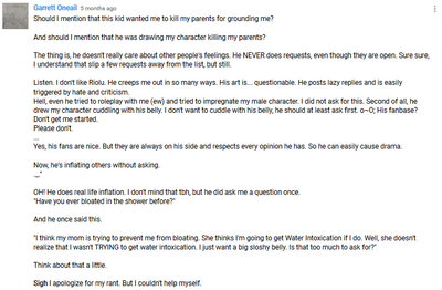 The fact that this guy and his atrocious works of art have pulled in over 1,000,000 page views in a span of six years, while many great artists squalor in comparative obscurity, should tell you a lot about the current state of DeviantArt, and its user base consisting of mostly teenagers, such as the GoAnimate community. In recent years, he's also been accused of convincing minors to give him pictures of their bellies inflated over on Discord.