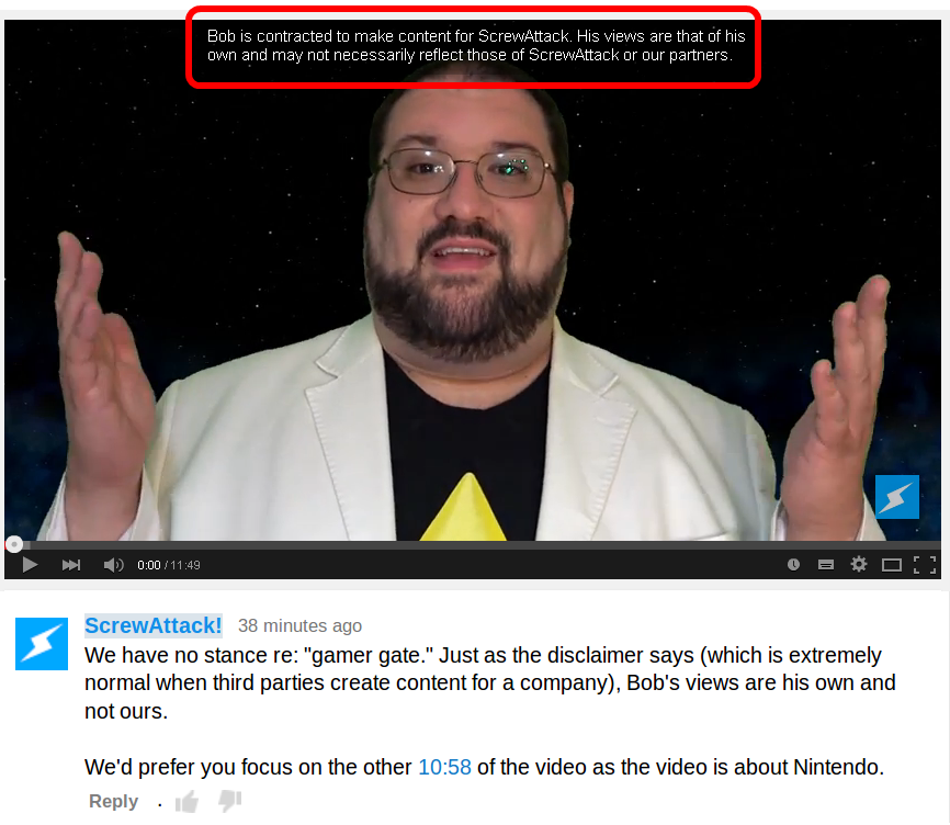 Bob then went crawling back to ScrewAttack for his old job back in one of the most pathetic displays the internet has ever seen. Effectively, Bob was now back exactly where he was in life 6 years ago, but not for long. While it appeared as if he got his old job back, when he couldn't resist comparing GG to Stormfront in the first video he made for them, ScrewAttack (after being bombarded with complaints) added a disclaimer to his video and revealed that even a second-grade channel of has-beens didn't want Bob and it was in fact him who begged them to let him make videos for them again for old time's sake.