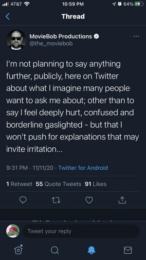 On November 10th, 2020, Lindsay Ellis was in a twitter thread with fellow youtubers about how Peter Coffin blocked them, saying "I’ve uncovered the conspiracy of… people being friends with their peers." Moviebob, being the gentleman that he is, responded by posting an image he took of him and Lindsay sometime ago, saying "I for one am positively shocked!" Lindsay, naturally, called him out for being a total creep and acting like her friend when they only shared one photo and she blocked him like 6 times.