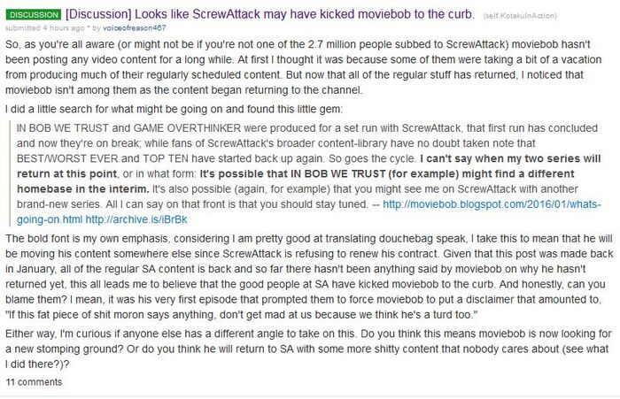 When Bob went crawling back to his old job, they did not outright hire him. Instead they took him on as a private contractor which means they don't have to give him any benefits (like insurance for Diabeetus meds), take responsibility for him sperging out, and don't have to find legit reason to fire him if as they can just let his contract run out. Last thursday some one in gamergate discovered after Movie Blob stopped posting