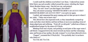 He goes into some truly unsettling details about his life. For example: How his entire family hates him to the point that after work he would hide in his car and play Mario instead of going inside and facing them, how he got bullied in school and how disappointed he was by Yoshi's Island revealing that Mario was born in a fictional place and therefore Bob's schizophrenic delusions of being him were shattered. He equates Mario related events to the assassination of JFK and 9/11 and the Console Wars to the Vietnam War and talks about watching Transformers at the gym (his love for a children's shows continues to this day while his dedication to losing weight is long gone) or playing video games to overcome his grandmother's death while the rest of his relatives handle it like adults.