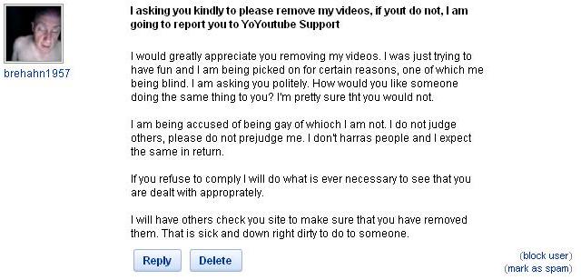 While it would seem impossible to conceive of failing at trolling a blind, horny pervert who hasn't a clue about YouTube, especially given how much of his personal information is readily available, on 12 July 2009, the unaware population managed exactly that. Firstly armed with their latest cool memes they proceeded to post such witticisms as: