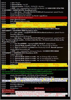 It must also be noted that several of the bots within #bookz also serve other types of files such as mp3 files. While this is great, the downloader must remember that these sorts of files are much larger than simple .pdf files. They are going to take much longer to download! Also, the IRC protocol isn't the best way to download files, it is often slower than other, more dedicated protocols. Use it when you can't find your files anyplace else...unless you are looking for a book.