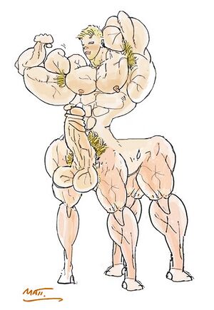 I had been overcome with lust for Roy the first time I laid eyes on him in the nude gay humantaur bar, one of my favorite places not only because it's one of the few nude bars I know of, but especially because the gorgeous muscular tall young naked guys there all have four arms and four legs! Even among them, Roy stood out. He was beautiful and broad-shouldered, blonde and with a rare and very sexy four-armed, six-legged body. He was very sexy and muscular, and set all of the naked humantaurs' huge hardons a-sway when his giant, gentle body bumped theirs in the crowded bar.