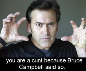 Widely regarded as a God among men and legend to teenage fanbois everywhere, Bruce Campbell's flawless intonation, facial expressions, and sheer awesomeness have dazzled millions for many years. Best known for his role in the Evil Dead movies and a common topic on /tv/, he's an all-too-common segue in zombie apocalypse threads amongst the elitist anal-retentive uber-nerds on /b/.