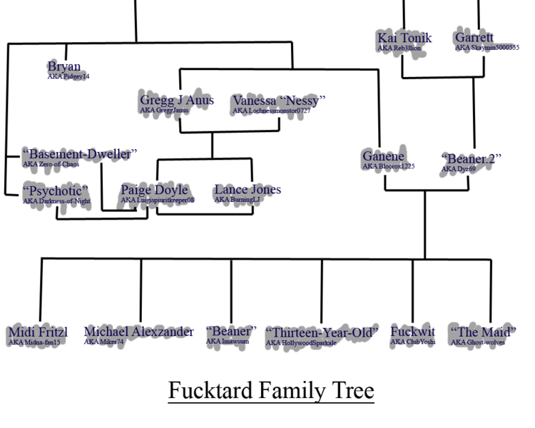 His entire family - he belongs to a large group - can be seen below in the Fucktard Family Tree. Please note, each member of the family can be found on DevianTART by typing in the AKA (As Known As) for a username. Goodluck.