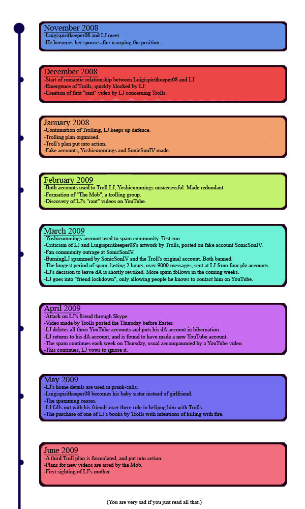 Most events discussed took place on LJ's fuckhole on DevianTART, where he used to reign supreme until the Troll-patrol-of-lol came along to fuck-it-up. However, his YouTube accounts were most affected. A refreshed version of the timeline shall be posted each month to cover that month's lulz-worthy activities. The majority of activities took place during the months of March, May, and April. If you feel an event needs to be added to the list please contact this page's editor.