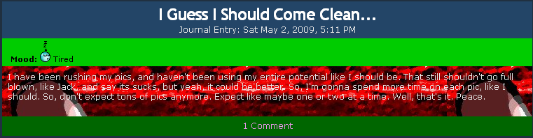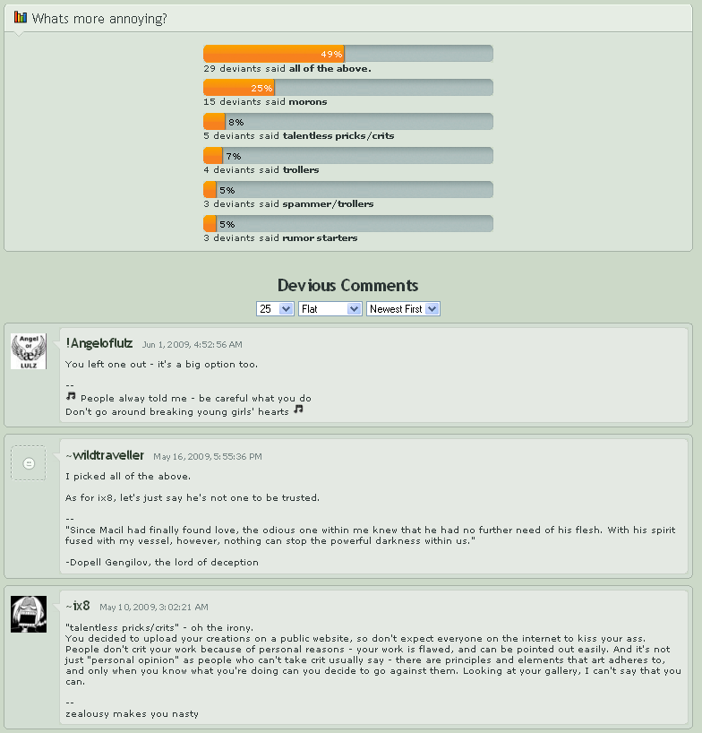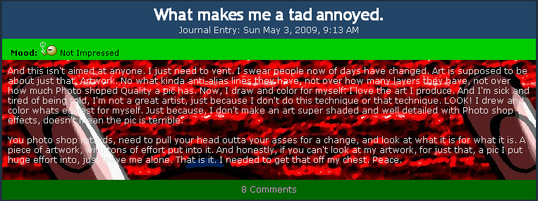 Her most recent journal; the context here is that a recent surge of critical trolls began spamming his page with advice, which he obviously rejected due to the continued shittiness of his art.