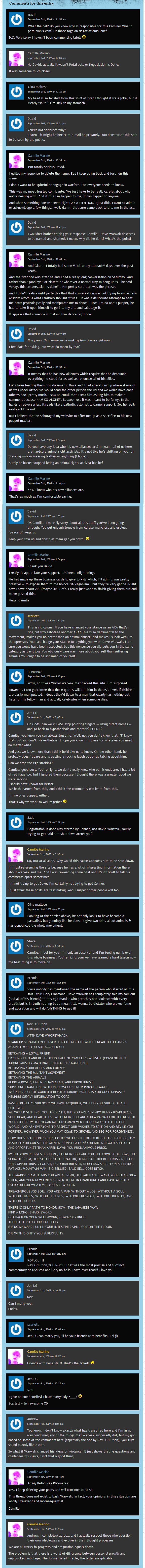 Under a false identity, Camille did what she does best by annoying the living shit out of legal scholar and animal rights advocate Gary Francione. Like a Forumwarz fanboy, she claimed victory after being banned in less than an hour, unable to comprehend that that being a complete cunt and actually believing the bullshit she spews does not make her an epic troll.