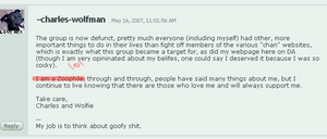 Charles-wolfman is a DeviantART user whom enjoys his animal companions in many wrong ways. Worse than a furry, he is a zoophile, and he is very proud of his sickening disorder. His DevianTart profile is filled with screencaps and zoophile rights propaganda. He was raided by 7chan.org in back when it hosted /i/, and much drama ensued.
