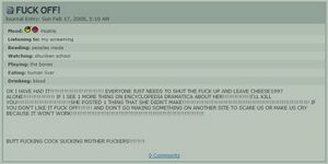 The best thing you can do for the Internet (and will probably be the high point of your life) is to become an insensitive fuck and go spamhappy on Cheese' profile. As with all lolcows, lulz are bound to be unleashed. If you possess some uber hacking skills, you may want to take it upon yourself to spam Tubgirl and meatspin all over her profile, because nothing traumatizes a retard moar then a tranny being analled. If you do this, you are a fucking Internet saint, and I will actually suck your cock (no kidding).