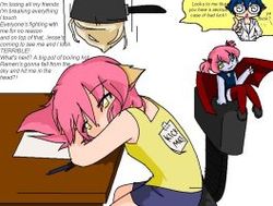 In the league of evil ex-boyfriends, Jesse is possibly one of the, if not the magnum opus. He is the one who had the most coverage as a boyfriend, and his relationship with Chii was arguably (but who would bother aruging about this, amirite?) the boyfriend who got the most coverage from Chii's shenanigans. Chii often draws him as a sexeh blue-haired cat boy with a sleek black and gray outfit, not unlike Ikuto from the anime about the eggs and lolis. Way to stay original even with real people, Chii. But as evidenced in photos of him, he ain't no looker tipping the scales at what looks like 400 pounds, long greasy hair, and a douchestache completeing the face only a mother and a desperate homeless, syphilis ridden, blind, wapanese mama-san could love. Still, their relationship was deep and they never ceased to deny that they were in absolute and true love forever and ever, never to part unless eaten by zombies and such. Jesse also had crucial technical skills that Chii's fanime-making-and-killing ass could use to further her quality to something out of the trenches of negative scales. Chii often drew Jesse as a woman, or as an over-exposed anime character with her bra showing, or even with huge tits and a maid outfit, which when you take a closer look at Jess it isn't to far fetched because he does have soggy pair of B-cup man boobs. Unfortunately this wasn't the case as she took the line between teasing and emasculating her boyfriend and ran a marching band over it, complete with elephants. But Jesse, being the loser he is/was/will alway be, took it with stride and smiles, all holding out for the day that he would get at teh vagoo.