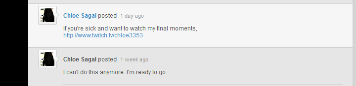 Instead, everyone who ever got harasses by Chloe with his death threats and demands for money and subsequently told him to go kill himself, people like Brianna Wu, Devi Evers, Zinnia Jones and Ian Miles Cheong, all started throwing blame onto each other and occasionally pointing a finger at Kiwi Farms along with GamerGate, Encyclopedia Dramatica,and the Alt-right, saying that they harassed Sagal and reported his facebook posts about suicide, when in reality, KF hasn't talked about Chloe in over 6 months and never directly interacted with him, ED hasn't updated this article in ages and Chloe's FB account was private, so the only one who could have been reporting her were her friends.