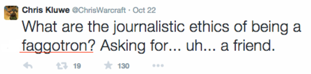 Not satisfied with his glorious results, Chris went back to twitter and called Mercedes a "Nacho shield" (because she's a fat spic), before blocking Mercedes so she couldn't respond. And with that, Kluwe added "racist" to his ever growing list of achievements as a "progressive".