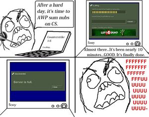 - Cunter-Strike: Sauce - The sequel that came with Half-Life 2. It is mostly known for its broken hitboxes. Later, Valve updated it to the buggy Orange Box engine (Team Fortress 2), which effectively turned the Steam forums into a warzone for quite some time. Many nerds ragequitted. This update included only minor new things like HDR, achievements, a kill cam, and an improved scoreboard, which broke the game for many months. The outrage was still lulzy as hell. This game is now mostly abandoned, thanks to CS:GO.